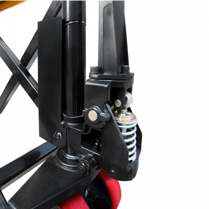 Благодаря телескопической конструкции гидроцилиндра, снижены габариты и масса тележки, что значительно повышает удобство ее эксплуатации. Ручка со специальным покрытием делает управление тележкой комфортным в любое время года. При подъеме вил на высоту 400 мм на землю опускаются дополнительные опоры, препятствующие перемещению тележки и повышающие ее устойчивость.