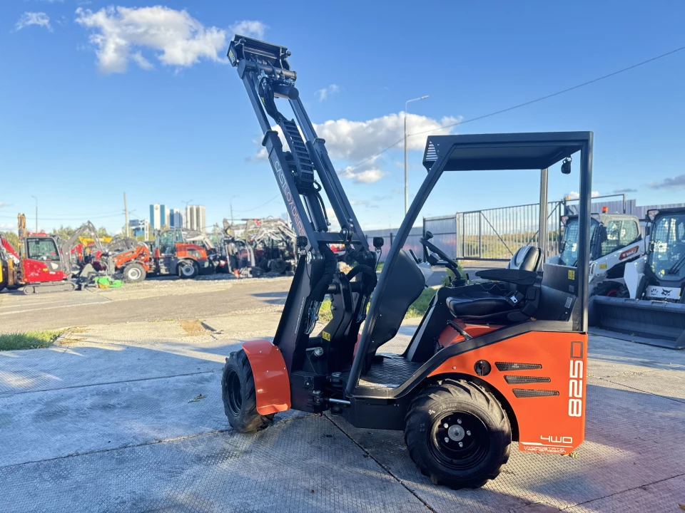 CASTLOADERS 825D был специально разработан для использования в ограниченном пространстве - сиденье водителя расположено сзади, а подъемная мачта на передней части поворотной рамы. Благодаря этому части рамы не выступают за габариты колеи движения погрузчика. Благодаря этому данный погрузчик популярен в небольших фермерских хозяйствах.