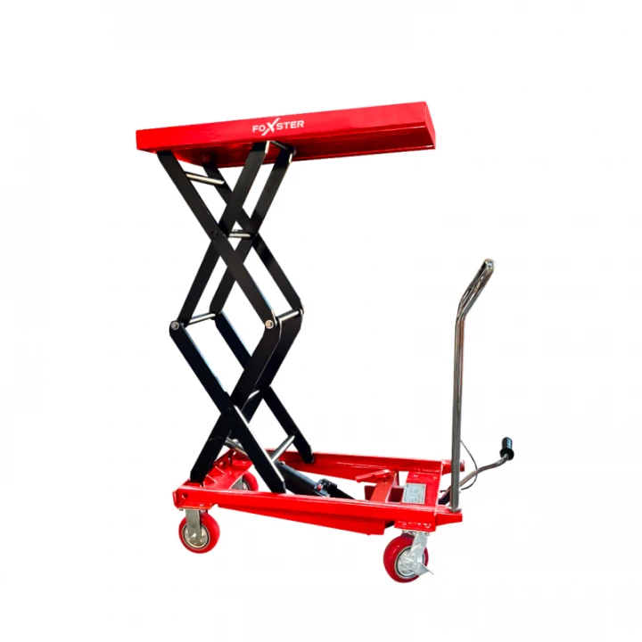 Механизм подъема – двойной ножничный посредством нажатия ногой на подъемный рычаг. Опускание осуществляется путем нажатия на себя управляющего рычага на ручке подъемного стола.