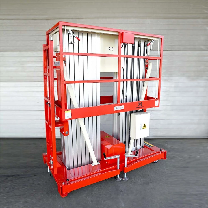 Этот двухмачтовый телескопический подъемник установлен на четыре колесных опоры и перемещается вручную. Вертикальное перемещение люльки производится благодаря двум раздвижным мачтам и электрогидравлическому приводу. Для управления используется электрощит на тележке и кнопочный пульт в люльке.