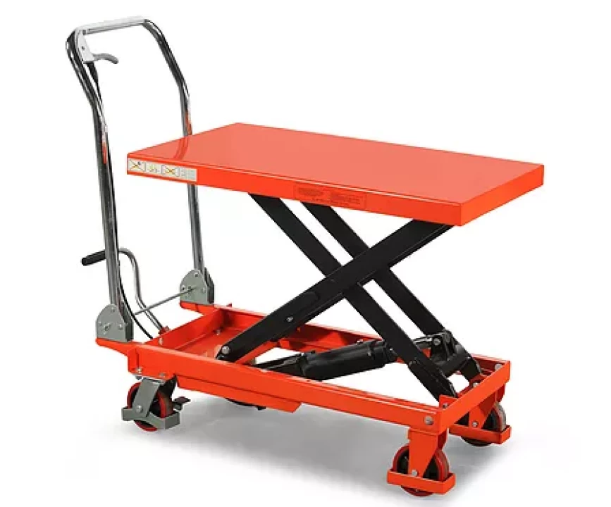 Модельный ряд тележек с подъемной платформой грузоподъемностью от 150 кг до 1000 кг, оснащаются одинарным ножничным подъемным механизмом.